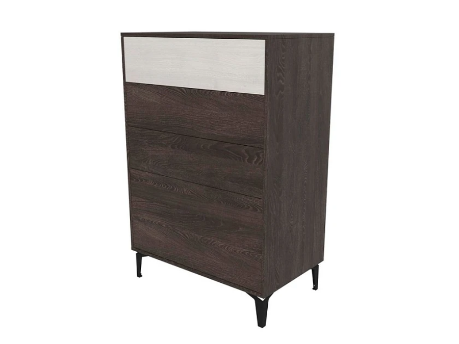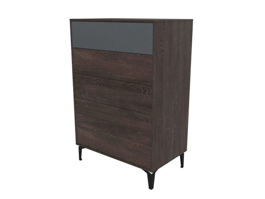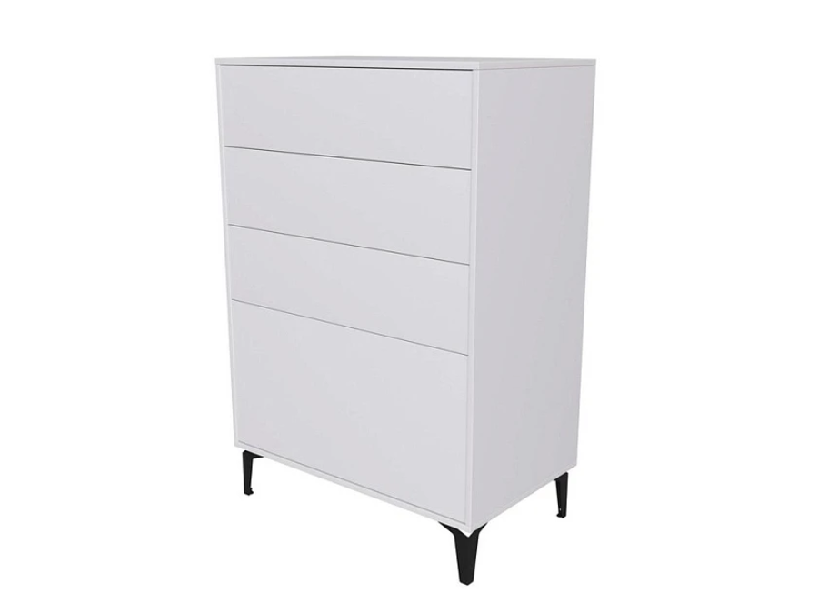 York - комод с продуманной конструкцией для тех, у кого есть дети или просто высокие требования к безопасности и порядку. Крепление к стене исключает опрокидывание, push to open делает ручки лишними, высокие металлические опоры оставляют место для уборки. Четыре ящика разной глубины, три компактных сверху и один глубокий снизу, дают логичную систему хранения без лишних усилий.